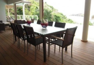 The living area is furnished with Italian made sofas, a Bimini chair and wooden coffee table; the dining area is furnished with a wooden dining table seating for ten, this whole area is accentuated with various pieces of carefully chosen art and sculptures. Two sliding doors open up to the shaded veranda and patio: here you will find the external dining area furnished with table and chairs, next by are the comfortable outdoor furniture which includes sofa, arm chairs and a coffee table. This is the ideal place to taste a cocktail with friends and family, to enjoy the sea breeze and to admire the Caribbean Sea located at few steps.