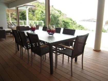 The living area is furnished with Italian made sofas, a Bimini chair and wooden coffee table; the dining area is furnished with a wooden dining table seating for ten, this whole area is accentuated with various pieces of carefully chosen art and sculptures. Two sliding doors open up to the shaded veranda and patio: here you will find the external dining area furnished with table and chairs, next by are the comfortable outdoor furniture which includes sofa, arm chairs and a coffee table. This is the ideal place to taste a cocktail with friends and family, to enjoy the sea breeze and to admire the Caribbean Sea located at few steps.