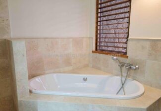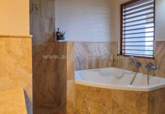 Three equally inviting bedrooms on the other side of the house feature snug double beds, side tables, and generously appointed walk-in closets. Each bedroom boasts its unique artistic flair, lending a distinct character to the villa. The private bathrooms in each room are adorned with bespoke fittings, accentuating the individuality of each living quarter.