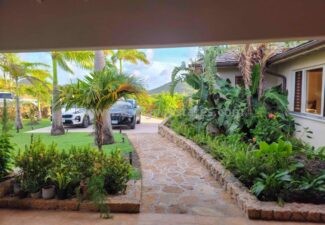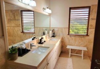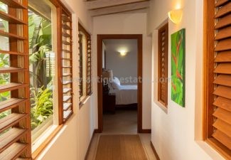 All bedrooms are equipped with air conditioning, ceiling fans, and French doors, ensuring comfort day and night. Before retiring, savor a nightcap on your bedroom patio, gazing at the celestial tropical sky. Alternatively, if you occupy the lower level bedroom, take a leisurely stroll through the delicately lit stone walkways of the lush tropical garden.