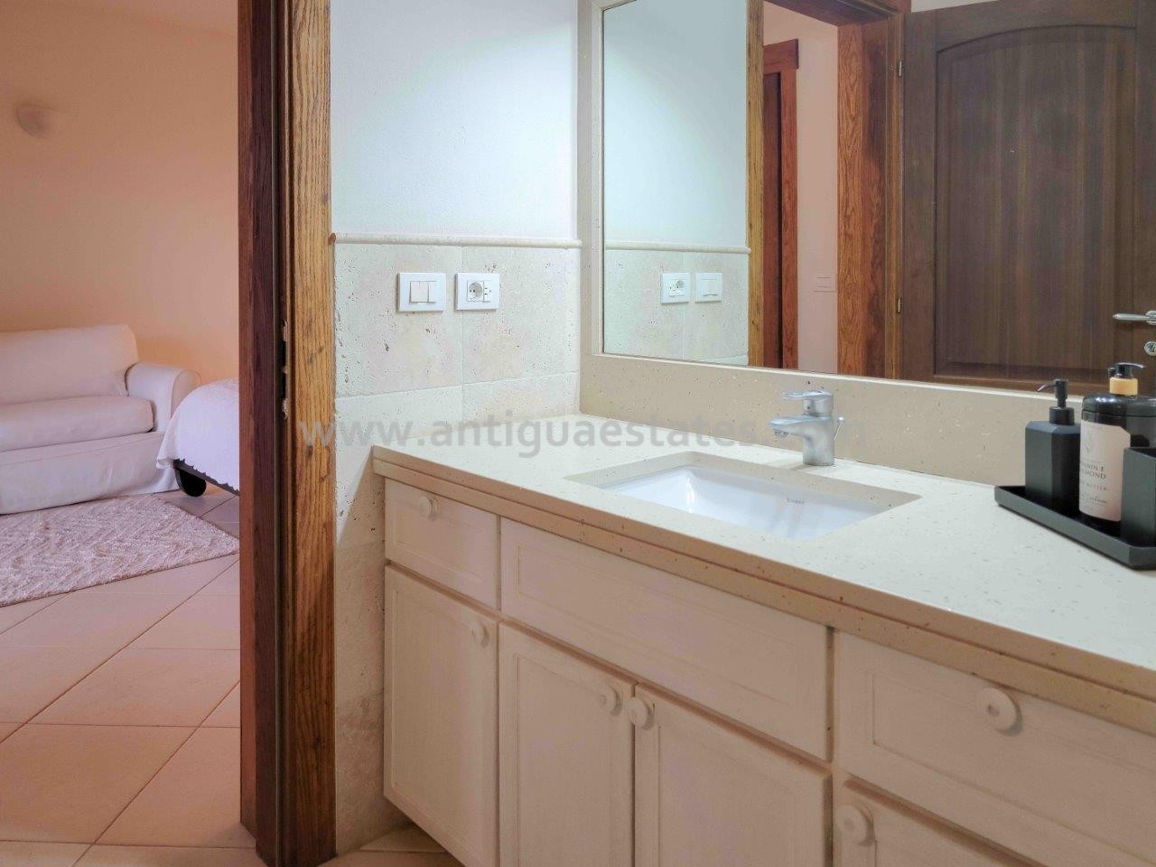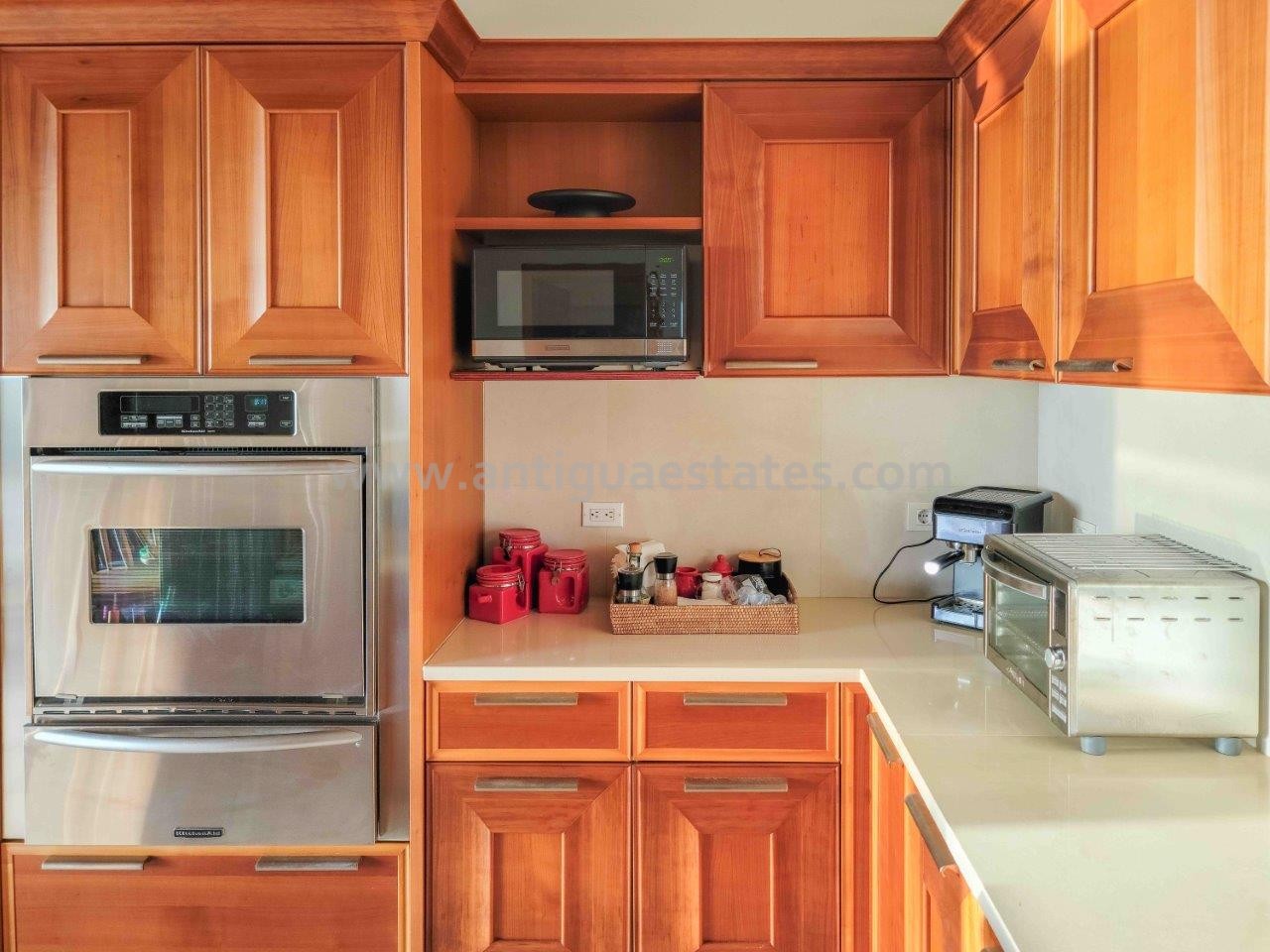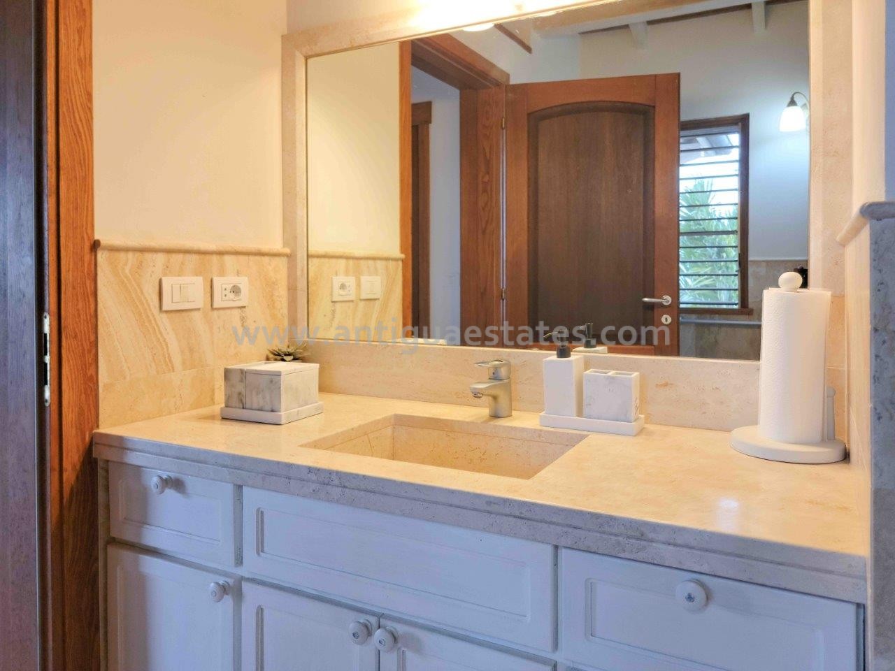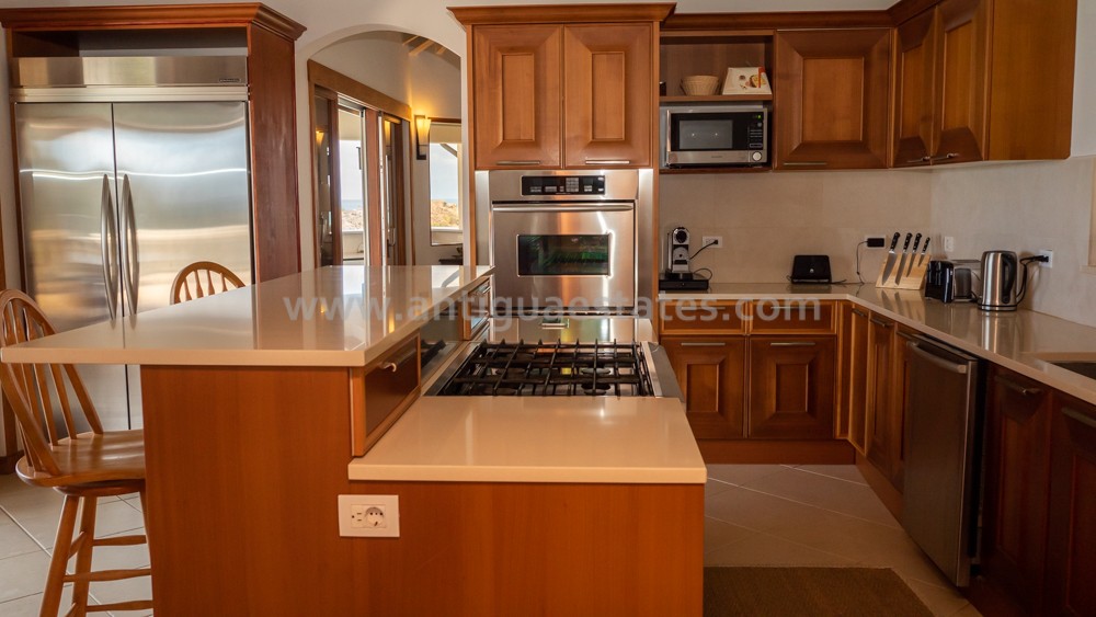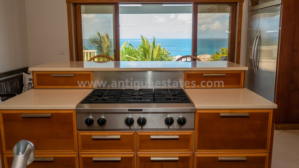 A chic contemporary kitchen beckons, a mere few steps away from the dining domain, striking the perfect balance between accessibility and discretion. Outfitted with top-tier appliances and graced by smooth white marble surfaces, this culinary haven offers both practicality and aesthetic charm. The kitchen’s windows frame captivating vistas of the azure Caribbean waters and the inviting swimming pool.