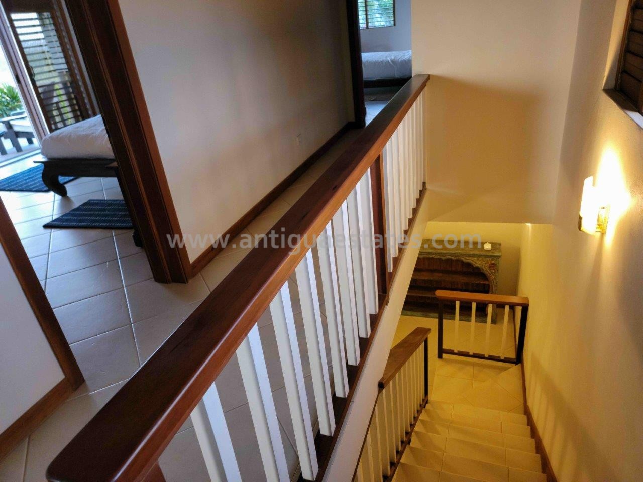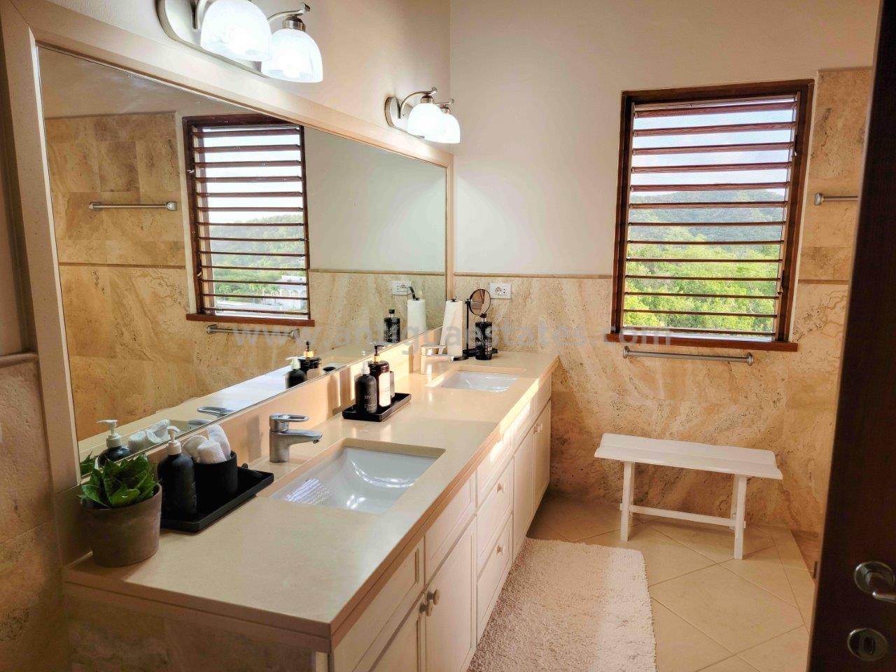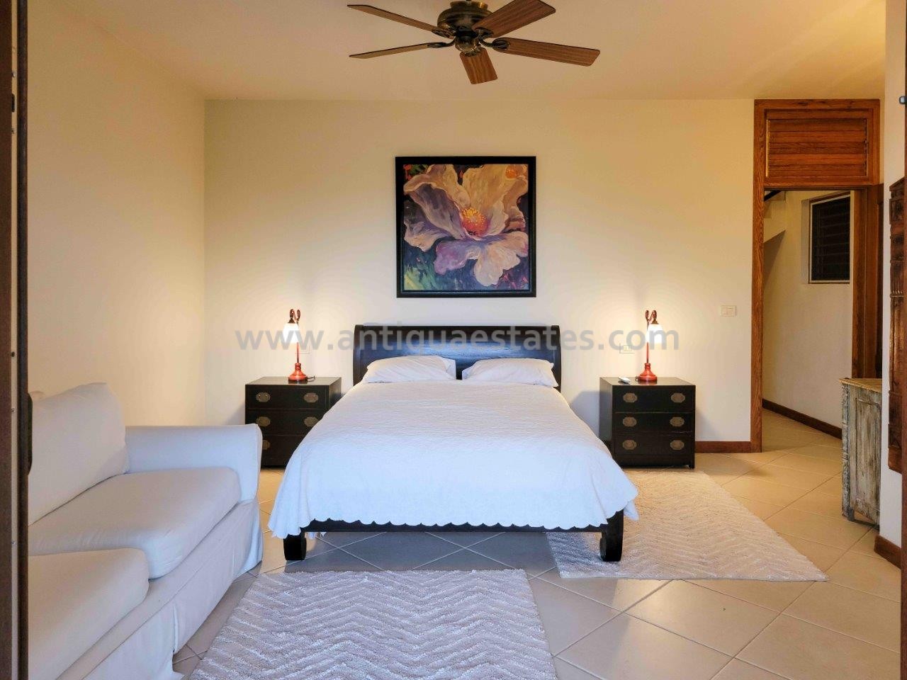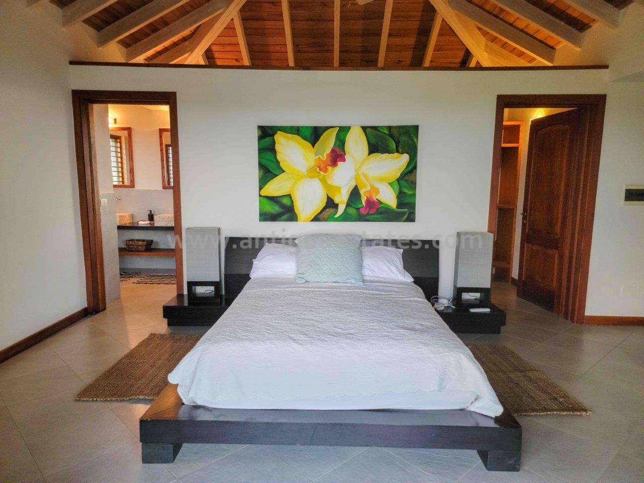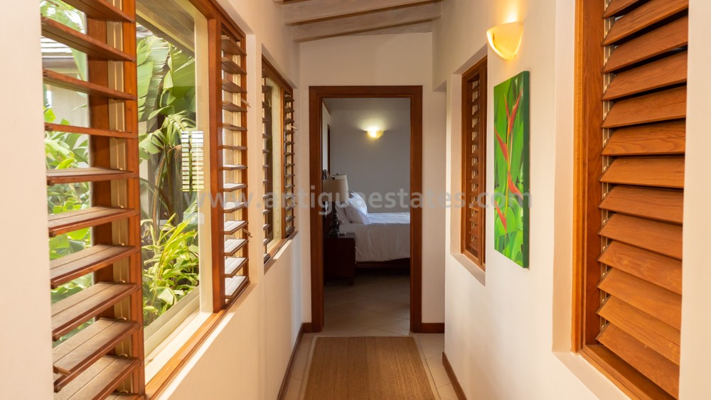 All bedrooms are equipped with air conditioning, ceiling fans, and French doors, ensuring comfort day and night. Before retiring, savor a nightcap on your bedroom patio, gazing at the celestial tropical sky. Alternatively, if you occupy the lower level bedroom, take a leisurely stroll through the delicately lit stone walkways of the lush tropical garden.