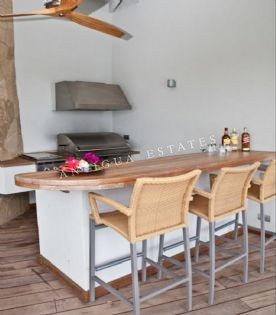 Villa Sugar Mill split level design spreads over 10,000 square feet of living and entertaining space. On the higher level the kitchen is laid out over about 400 sq ft of space boasting its attractiveness and warmth owed to the professional grade stainless steel appliances.